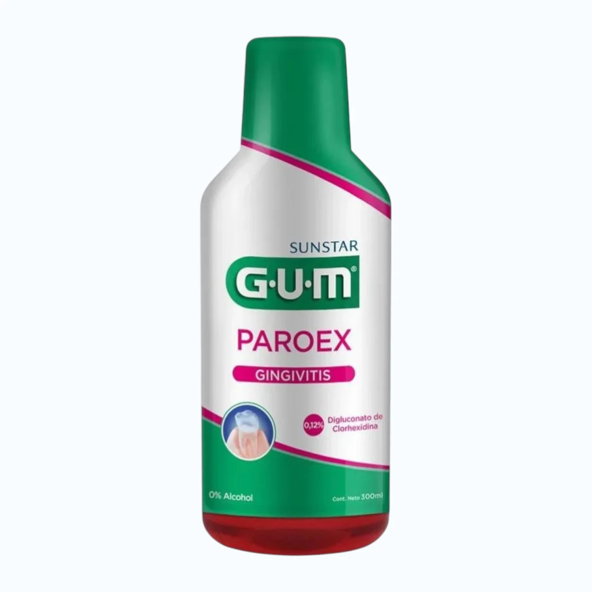 El Enjuague Bucal GUM Paroex 300 ml está formulado con clorhexidina al 0.12%, un agente antiséptico de uso clínico que combate eficazmente la placa bacteriana y ayuda a tratar la gingivitis. Es ideal para personas con problemas de encías o en procesos postoperatorios dentales.