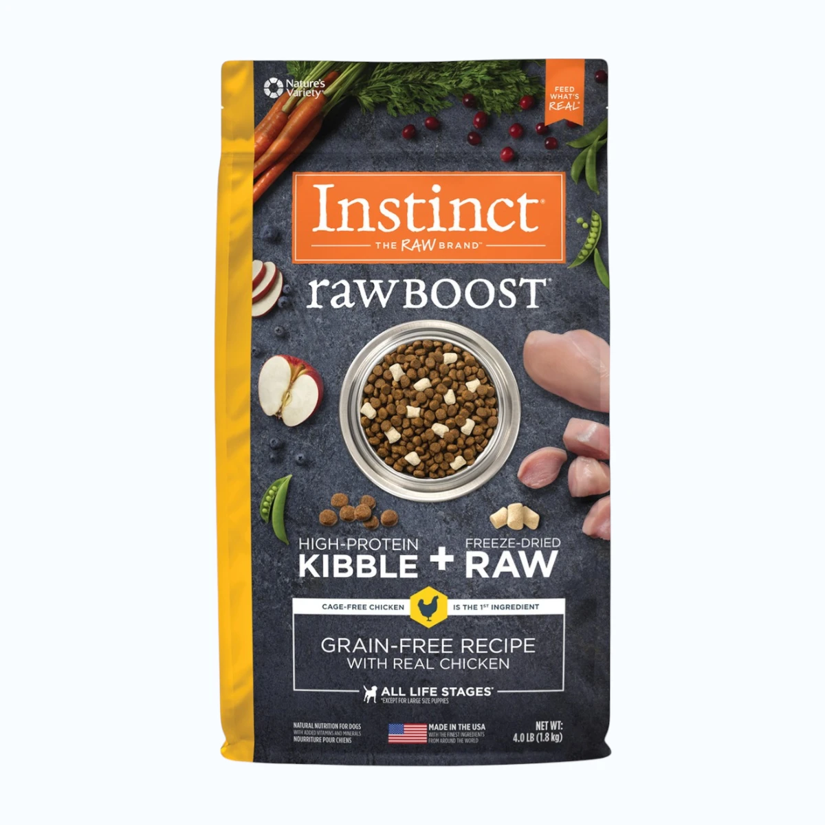 Instinct Raw Boost combina lo mejor de la nutrición seca con el poder ancestral de la alimentación cruda. Cada porción contiene carne de pollo libre de jaula como fuente principal de proteína, brindando una base nutritiva para desarrollar músculos fuertes, magros y sanos.