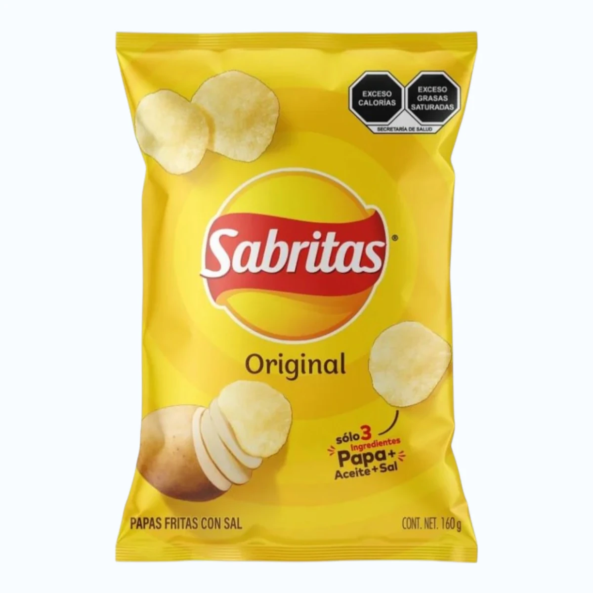 Las Papas Fritas Sabritas Original 160 g son la versión más generosa del clásico más querido de México. Con 55 g adicionales respecto a la presentación de 105 g, este formato ofrece más papa, más sabor y más momentos de disfrute al mejor precio. Sabritas garantiza en cada bolsa la misma calidad y autenticidad que la han convertido en la botana favorita de México por más de 70 años. A $45 MXN, es la botana más clásica, confiable y satisfactoria para compartir en cualquier ocasión.