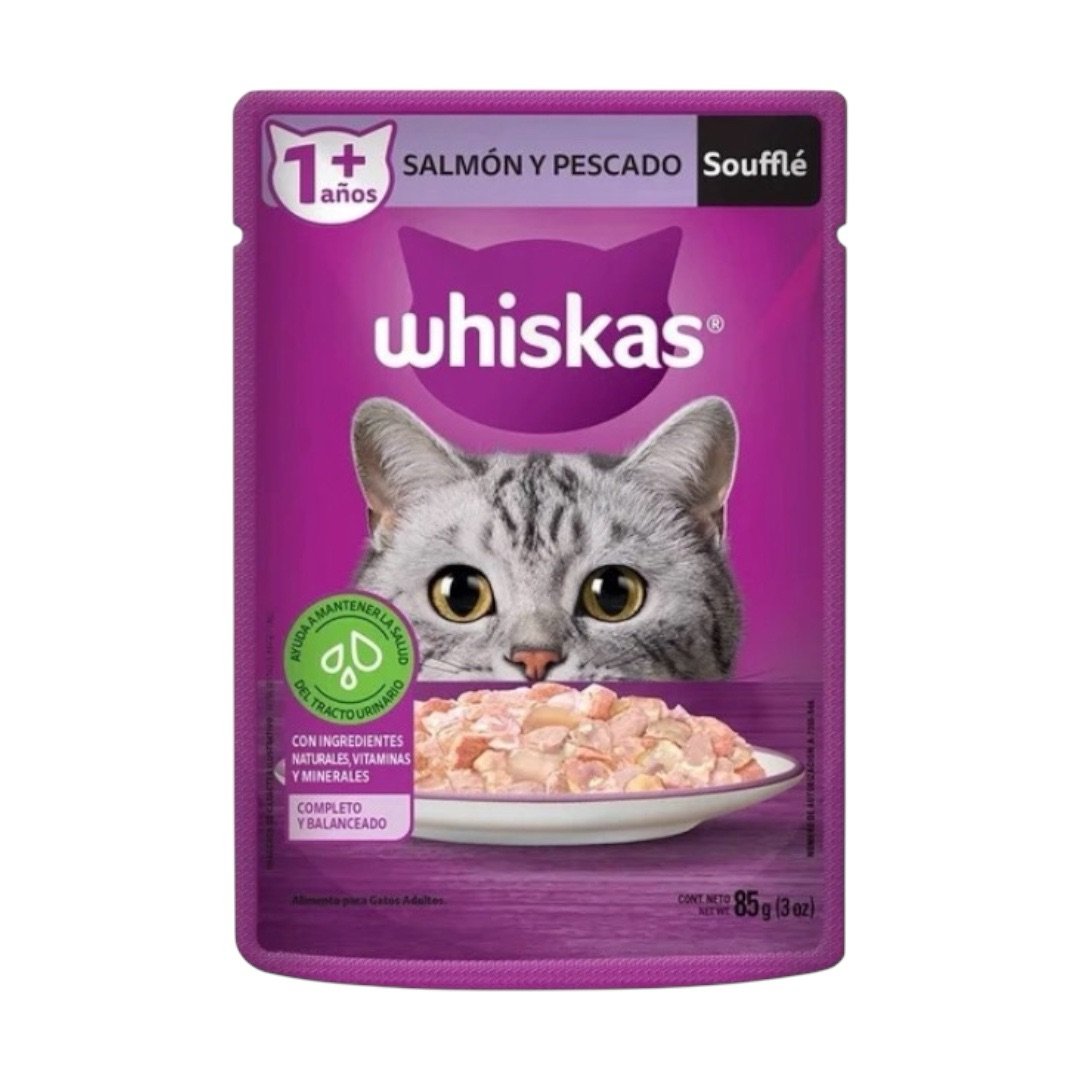 Whiskas Adulto Soufflé Salmón y Pescado de 85g es una opción de alimentación gourmet, meticulosamente diseñada para satisfacer las necesidades de gatos adultos. Este producto se caracteriza por incorporar ingredientes de alta calidad con una mezcla de salmón y pescado, brindando un festín saludable y delicioso para los paladares felinos más exigentes.